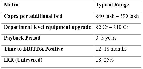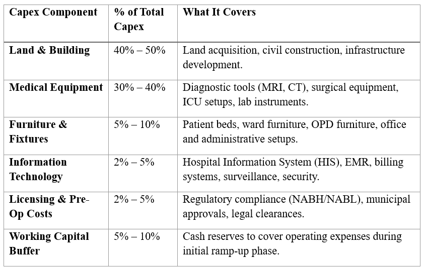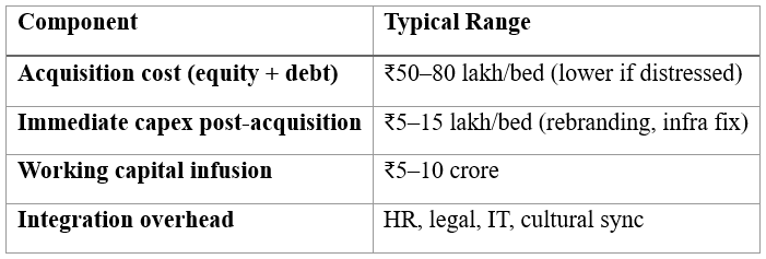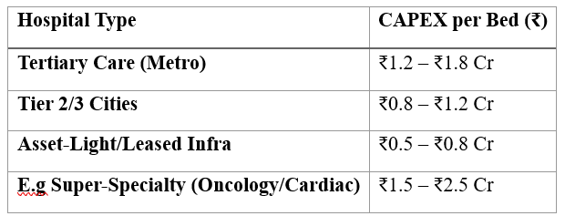 A mid-tier multispecialty hospital may spend ₹80 lakh–₹1.2 crore per bed.