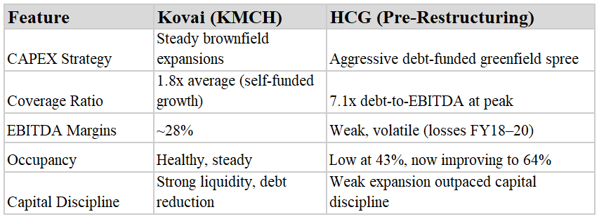 As investors, this is where it gets interesting and dangerous. Because in the hospital sector, CAPEX isn’t just a page in a book. It’s a bet. A bet on demand, pricing power, doctor loyalty, regulatory stability, and capital discipline all at once. And the outcomes can be polarizing: some players compound capital like surgeons with steady hands (think KIMS or Kovai), while others bleed it away like a misdiagnosed patient (HCG circa 2017–2020).